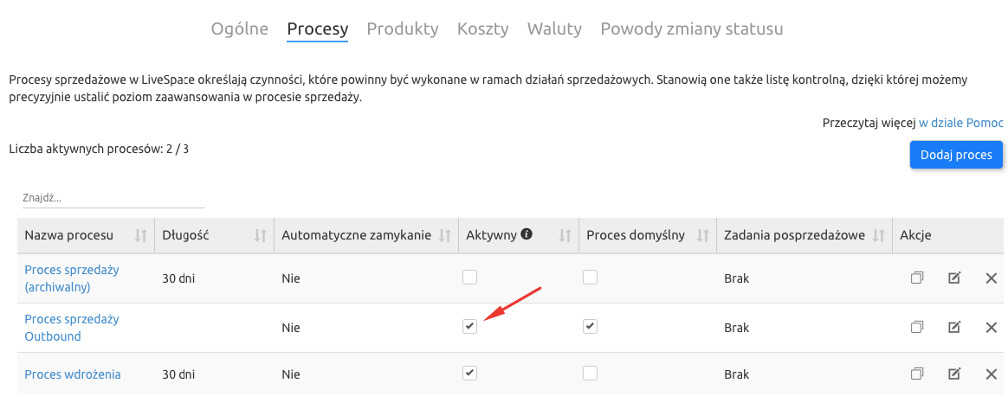 Aby ułatwić sobie pracę warto nadawać procesom sprzedażowym nazwy, które będą jednoznacznie wskazywać na okoliczności, w jakich z nich korzystasz. Możesz np. wprowadzić rozróżnienie na proces sprzedażowy, który stosujesz aktywnie pozyskując klienta oraz proces, który stosujesz, gdy dostajesz zapytanie ofertowe. Procesy te będą się różnić od siebie – w pierwszym przypadku zaczynasz od nawiązania kontaktu z klientem i ustalenia, czy potrzebuje on twoich usług, natomiast w drugim przypadku masz już sprecyzowane wymagania i wiesz, czego i na kiedy klient potrzebuje. Dla tego przykładu wygodnym rozwiązaniem będzie nazwanie procesów np.: Aktywna sprzedaż oraz Zapytanie ofertowe i oznaczenie jako domyślnego procesu tego, który jest częściej używany przy otwieraniu nowej szansy sprzedaży, np. Aktywna sprzedaż – jeśli otwierasz więcej procesów sprzedażowych samodzielnie niż masz w wyniku zapytań.