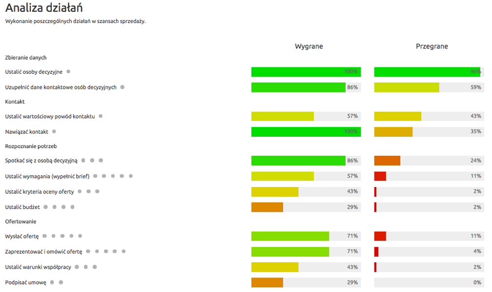 Co ważne, każdy z procesów sprzedaży możesz analizować pod kątem skuteczności. Wgląd w skuteczność podjętych działań pozwala wyciągnąć wnioski i optymalizować każdy z procesów. Dzięki temu sprzedawcy mogą podejmować takie aktywności, które faktycznie przekładają się na pozyskanie klienta i nie tracą czasu na działania, które nie mają przełożenia na wygranie szansy sprzedażowej. Tobie z kolei daje to możliwość np. porównania skuteczności poszczególnych procesów i skupienia się na tych, które mają największą skuteczność.